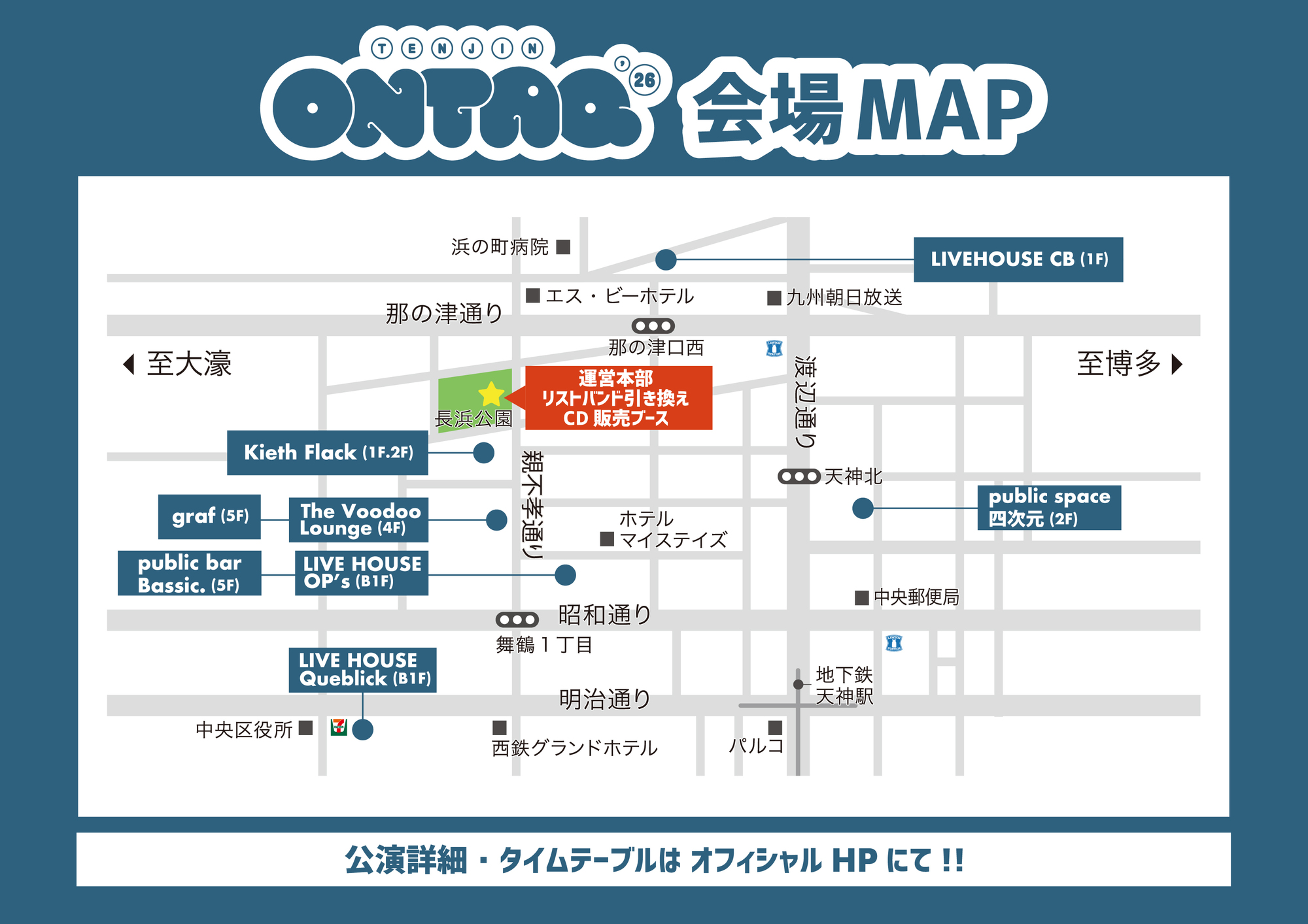 福岡天神地区8会場 (graf / Kieth Flack / LIVEHOUSE CB / LIVE HOUSE OP's / LIVE HOUSE Queblick /public bar Bassic. / public space 四次元 / The Voodoo Lounge)